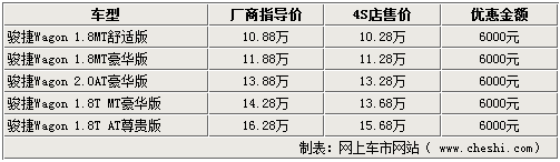 据销售人员介绍,虽然两款增压版骏捷Wagon车型调价,但各店内销售的骏捷WAGON车型仍可给出1.1万元的现金优惠,店内在售的主要为1.8L的手动版车型,而2.0L以及1.8T的车型较少,如需购买仍需提前预订,订金为5000元,一个月左右的时间即可提车。
