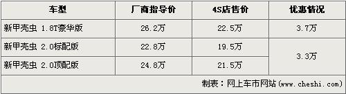 据4S店销售人员介绍:目前甲壳虫全系有最高3.7万元的优惠。经3.7万元优惠后,1.8T豪华型售价从26.2万元下降到了22.5万元。2.0L的标配版和顶配版经3.3万元优惠后,售价分别将为了19.5万元和21.5万元。