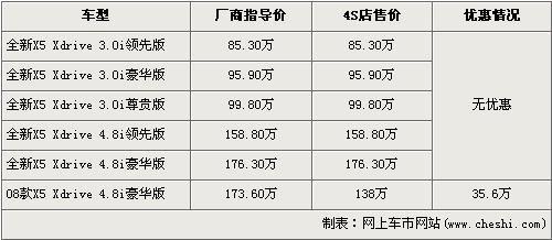 据经销商处销售人员介绍,店内还有一批售价为173.6万元的08款X5 4.8i豪华版现车,目前此批车有35.6万元的优惠,经优惠后售价降到了138万元。销售人员还介绍,新款的X5全系没有现车,欲购买者需交订金10万元,约等2个月才可提车。