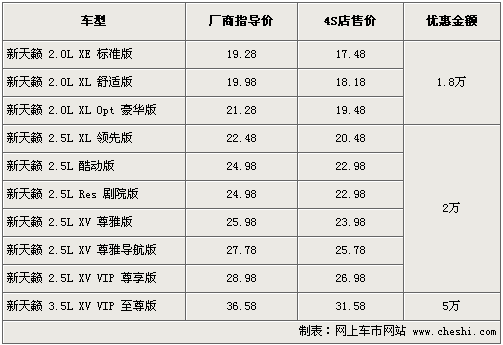 作为日产全球首发的旗舰车型,东风日产新一代天籁于去年4月上市后一直占据中级车销售中稳固地位。近日,根据网上车市网站价格监测系统显示,新天籁还将持续举行购车送全险活动,最高优惠可以达到5万元。具体车型见下表: