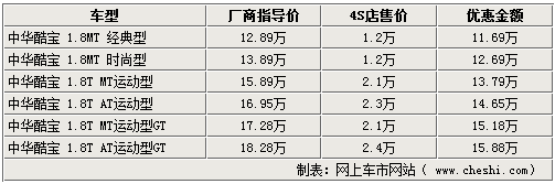 酷宝系列车型,不仅外形时尚,动力也相当充沛,不仅可与进口跑车如莲花竞速相媲美,也带动了自主跑车市场的竞争。近期网上车市网站了解到,随着市场竞争的加剧,现在北京的中华4S店内最高可给出24000元的现金优惠,令此车型再次引起关注。具体详情如下: