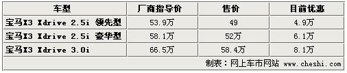 继X5成功的引进我国后,宝马又将其X系列旗下的紧凑型SUV宝马X3带到了中国。目前国内在售的X3 2.5Si与X3 3.0si是在X3基础上衍生而成的运动版车型,将宝马特有的灵敏性与运动型多用途车的广泛实用性完美结合。近日据网上车市价格数据监测显示,宝马X3全系最高有近8.1万元的现金优惠,具体详情请看下表: