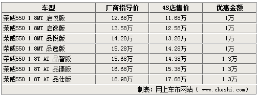 据销售人员表示,目前购买1.8T荣威550车型全系可以优惠1.3万元,并加赠超值的保养及装饰,同时,各店1.8L的荣威550车型也相当充裕,颜色齐全,购车用户可享受最高1万元的优惠。其他4S店也基本维持在这个优惠基础之上进行销售,不论是1.8T还是1.8L车型均可满足消费者的购车挑选需要。