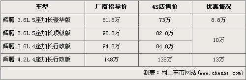 据北京进口大众经销店销售人员介绍,目前辉腾3.6L 5座加长豪华版有8.8万元的现金优惠,经优惠后3.6L 5座加长豪华版的售价降到了73万元,跌破了75万元。排量稍大的4.2L 4座加长行政版有13万元的优惠,经优惠后售价从148万元下降到了135万元。销售人员还介绍,4.2L辉腾没有现车,欲购买的消费者需交订金10万元预订。