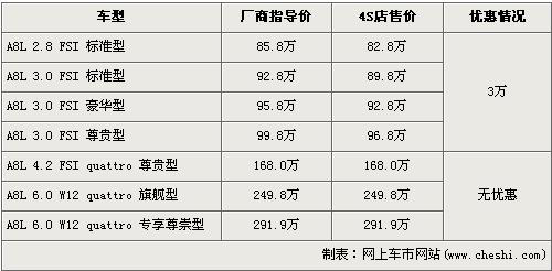 据北京奥迪经销店销售人员介绍,2.8L和近期刚上市的3.0L店内有现车,并且购买的消费者可以得到3万元的优惠。经优惠后,全系最低配的2.8 FSI标准版售价从85.8万元下降到了82.8万元。销售人员还介绍,4.2L以及6.0L Quattro版车型均无现车,欲购买着需交10万订金,等半年左右才可提车。