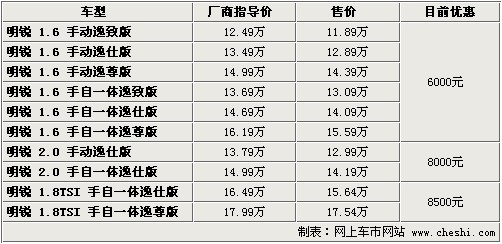 据4S店销售人员介绍:目前明锐全系最高优惠8500元,部分车型有现车,颜色包括银色、灰色车型。如需预定需等待1个月至3个月时间。目前1.6升车型优惠达6000元,2.0升车型优惠仍为8000元,1.8TSI的两款车型优惠8500元,较之前有所缩水。如在店内做装饰还可打8折,虽然折后装饰价格仍有些偏高,但产品质量可以保证。