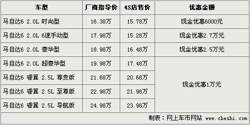全新马自达6睿翼在4月份正式上市,在继承了马自达6老款车风格同时,睿翼在外观和内饰上带给消费者耳目一新的感觉。与此同时,老款的马自达6与睿翼同时销售,两款车的价位区间覆盖从17万-25万,为消费者购车提供了较大的选择空间。根据网上车市价格监测系统显示,目前睿翼全系优惠幅度加大,老款马6最高优惠2.7万元。具体行情如下: