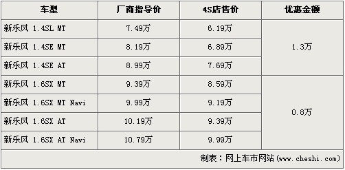新乐风是雪佛兰旗下的三厢入门级家用车销售主力,但由于上市多年,消费者对于它也产生了审美疲劳。在今年的5月份,带有家族新特征的小改款新乐风来到世人眼前,外观的改进让此车动感不少。近日据网上车市价格系统检测显示,新乐风出现了最高1.3万元的优惠,具体价格详情请看下表: