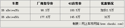 据北京宝马经销店销售人员介绍,现在在售的X6车型分为售98.3万元的35i车型和售价为177.8万元的50i两款车型。目前购买35i车型的消费者没有优惠,提现车还要加价2.5万元,售价从98.3万元上升到了100.8万元,排量更大的4.4升的50i车型有32万元的现金优惠,售价降到了145.8万元。销售人员还介绍,近期50i车型车型没有现车,消费者需交订金10万元,下个月可提车。