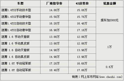自来势汹汹的速腾1.4TSI车型于上个月上市以后,一汽大众旗下主打紧凑车市场的速腾车系队伍再次得到了扩大,同时也得同级竞争车型带来了强烈的竞争。近日据网上车市价格系统检测显示,少量速腾1.4TSI现车已经进驻一汽大众4S店,并且全系有最高1万元的优惠,具体车型价格详情请看下表:
