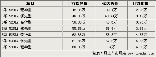 据4S店销售人员介绍:目前宝马5系最高优惠4.86万元,部分车型有现车。520Li领先型由于销量不好,所以暂时停产,目前2.0排量车型只有520Li豪华型。523Li系列车型只有523Li豪华型有现车,但颜色不全只有银色黑内饰车款,如预定523Li领先型需等1-2个月时间。525Li系列豪华型有现车,颜色为银色、白色及灰色,525Li领先型车款预订需等1个月时间。530Li领先型有金色、银色现车,530Li豪华型有灰色现车。目前最高优惠可达4.86万元,优惠幅度较大。