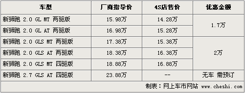 东风悦达起亚狮跑和北京现代途胜属于同平台车型,但相比途胜,狮跑外观更有活力。现售的09款狮跑,时尚的外观和改款后配置的重新升级,使狮跑在同级别中的性价比进一步提升。根据网上车市价格监测系统显示,目前狮跑最高优惠现金2万元,具体行情如下: