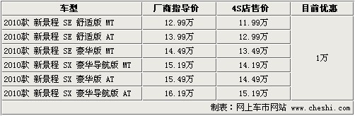 据4S店销售人员介绍:北京地区2010款景程最高优惠1万元,作为一款新上市车型,1万元优惠幅度算是比较大的。目前现车较为充足,但只有手动舒适版、自动舒适版、手动豪华版、自动豪华版车型有现车,其余2款导航版车型无现车,如需预定需等待2周时间。10.88万元的手动基本型无现车,预订等半年时间。这款车一般只有政府采购,个人很难买到。目前在售现车颜色包括黑色、金色、银色等。