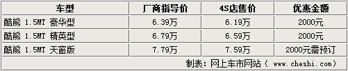 酷熊作为长城汽车在市场上推出的第三款轿车产品,凭借极具个性的造型和宽大的内部空间,使很多消费者都对其非常感兴趣。新车价格分别为豪华型6.39万元、精英型6.79万元,天窗版7.79万元。近日,网上车市网站了解到,长城汽车4S店处的天窗版酷熊仍然处在无车销售的状态,其他两款车型有现车销售,可以给出2千元的优惠。具体详情如下: