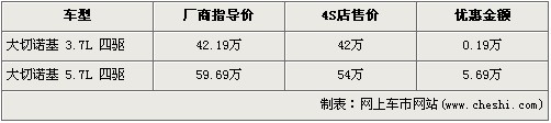 吉普大切诺基是吉普家族中极具个性的一款大尺寸车型,在推出3.7L排量车型后,消费者的选择空间更大,同时带给驾乘者完全不同的驾驶体验。根据网上车市价格监测系统显示,目前大切诺基最高优惠5.69万元,具体车型以及价格如下: