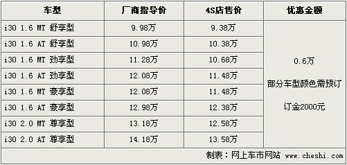 据北京现代4S店销售人员介绍,目前现代i30现金优惠6000元,店内有少量1.6舒享型及1.6豪享型现车,颜色以红色、黑色、银色为主。其余车型预订最快1周可提车,订金为2000元。关注此车的朋友可致电4S店详询,北京地区各4S店由于订单不同,各店销售的现车颜色有所不同。