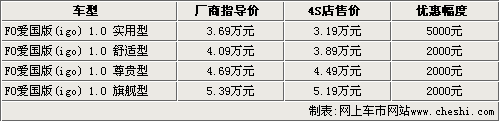 比亚迪F0作为该品牌旗下的首款微型轿车,于年初推出了爱国版igo系列车型,售价3.69-5.39万元。据网上车市网站价格监测系统显示,相比前段时间比亚迪F0最高优惠6000元的降幅,近日优惠幅度有所缩减,全系车型最高仅优惠5000元现金。详情如下: