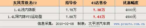笔者近日走访北京东风雪铁龙4S店时获悉,目前店内一批1.4L C2增配车型正进行促销,除了增加(驾驶座椅高度可调、电动后视镜、电动后窗)等配置外,现金优惠方面也最高达到了4500元,算下来累积优惠达到万元左右。据了解4S销售人员表示他们更看好1.4升车型在北京市场的销售,原因主要是C2作为一款以运动、时尚和外观为特点的小车型,吸引的更多是年轻人的目光,而这批独有颜色的车型也是为了迎合了此类需求。
