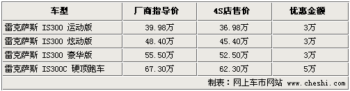 据4S店销售人员介绍,目前雷克萨斯IS300供应的车型均为2010款,新款车型比老款增加了诸多配置,性价比更高。同时现车方面,入门级和炫动版车型的现金优惠为3万元,豪华版暂时没有现车,需要预订。硬顶敞篷跑车IS300C的优惠幅度则达到了5万元。