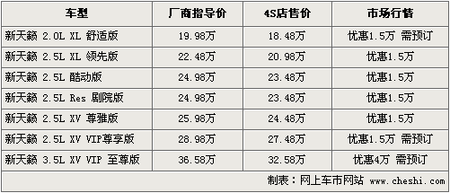 据东风日产4S店销售人员介绍,目前新天籁3.5车型的优惠最高可以达到4万元,其余车型均可以享受到1.5万元的现金优惠,入门级车型优惠后售价为18.48万。目前销售以2.5车型为主,2.0车型、2.5高配车型和3.5车型都需要预定,订货周期在1-2周时间左右。现车颜色方面以黑色、银色为主。由于各店的订单不同,各店销售的车型和颜色有所不同。