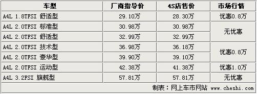 据北京一汽奥迪经销店销售人员介绍:目前A4L全系现车比较齐全,除1.8TFSI及3.2L车型现车较少以外,其余车款均有现车。现车颜色主要有银色、灰色、红色等,如预定其他颜色车型需预定,预定最少等20天,最长等待1个半月。1.8TFSI及3.2L车型等待时间较长,需等3个月时间。优惠方面,目前全系最高优惠1万元,其余车型均有8000元左右的优惠幅度。现购车取消了加价,并还有一定幅度的优惠,此时购车比较划算,喜欢的消费者请及时与店内联系。