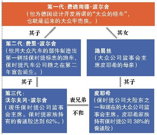 这是因为,保时捷家族最有权势的人物是保时捷公司监事会主席沃尔夫冈·保时捷,而皮耶希家族的统帅当然是保时捷公司大股东之一和现在的大众公司监事会主席皮耶希,他们均属于各自家族的第三代,也是一对表兄弟。