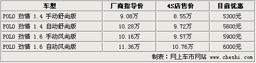 据4S店销售人员介绍:目前POLO劲情全系仅为4款车型。之前的1.4升手动挡两款车型合并为1.4手动舒尚版,1.4升自动挡两款车同样合为1.4自动舒尚版。其余1.6升两款车型不变。目前全系最高优惠6000元,其余三款车优惠幅度都有所不同。目前全系现车比较少,个别车型仅有1-2台现车。但目前有在途中车辆,最短等待1周,最长等待2周时间。我们建议购买银色、蓝色、红色车款,这3种颜色车型预定时间短,且店内个别车型有此颜色现车。