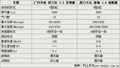这两款SUV车型均搭载的是V型6缸发动机,排量都在3.5升这个区间。但是在发动机技术上却存在着本质区别。广汽丰田汉兰达的发动机配备了双VVT-i技术,实现了卓越的动力输出,同时进一步提高了燃油经济性。进口大众途锐则配备的是动力更加突出FSI发动机,该发动机采用燃油缸内直喷技术,这一点从最大功率和最大扭矩的输出就可以看出。在变速器方面途锐则是略胜一筹,配备了6速手自一体变速箱,令变速更平滑顺畅,该变速器还带有DSP的智能动力换档系统,能辨认出您的变速习惯,使驾驶员充分享受到驾驶的乐趣。进口大众途锐刹车系统采用的是散热性能良好的前后通风盘,汉兰达采则采用的是前通风后实心。