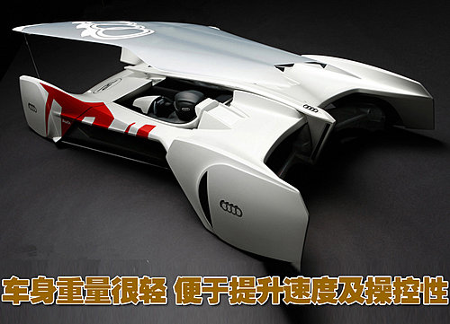 一个小型太阳能飞艇将会辅助奥迪这款概念车,为驾驶员提供路况信息,此外这个小型飞艇还配置摄像头以及传感器,目的是让驾驶员能够了解该车该车的速度以及整体车辆的性能状况。与之同时,为了进一步提升该车的速度及操控性能,该车的车身重量也最大限度的有所降低。