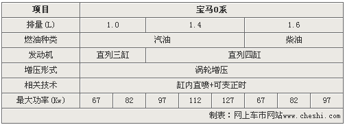 宝马0系作为宝马首款超紧凑型延续精准操控的同时,搭载了多款小排量涡轮增压汽油和柴油引擎。其中由于发动机调教和电脑匹配的不同,1.0和1.4涡轮增压汽油引擎可分别调出两款和三款不同的最大功率引擎。而1.6涡轮增压柴油引擎,也可以分别调出67Kw、82 Kw和97 Kw三种不同的最大功率。小排量涡轮增压引擎的运用,不仅可以提升宝马0系动力性能,而且也进一步降低了整车油耗。