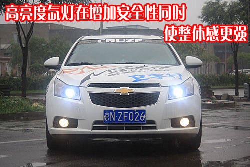 这个“街跑”科鲁兹主要针对外观进行了一系列改装。首先,它的车头部分最为显著的改变在于增加了高亮度的氙气大灯,使原本炯炯有神的“鹰眼”更加夸张,不仅看起来漂亮,而且提高了夜间行驶安全性。