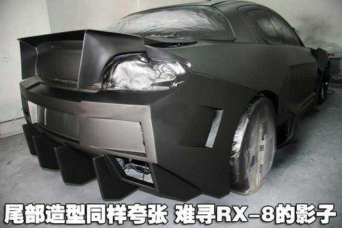 RX-8改装版的尾部造型虽然与兰博基尼盖拉多不太相像,但夸张的造型令人印象深刻,上翘的后尾翼、硕大的后底部导流槽,方方正正的造型绝对很夺人眼球。