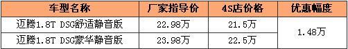 近日,爱卡汽车网从北京捷亚泰一汽大众4S店得到消息,迈腾1.8TSI DSG的静音版车型现在可以优惠1.48万,最低售21.5万。