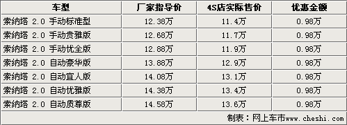 索纳塔作为北京现代销售的第一款车型,在中国地区销售了已经快7年了。随着新车型的增加,索纳塔已经渐渐的失去了市场竞争力了。在4月的上海国际车展上,北京现代展出了自主研发车型新索纳塔BT01,一经亮相就立刻受到了中国消费者的关注。近日我们从北京现代内部人士处获悉到,主研发车型新索纳塔BT01将于7月份正式推出。与此同时,根据网上车市价格监测系统显示,目前销售的索纳塔全系均出现了大幅优惠,2.0标准版车型的售价仅为11.4万。具体车型售价见下表: