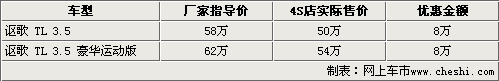09新款的讴歌TL在去年12月份正式进入国内市场销售,相比之前老款车型,09款在外观、性能、排量上均有不同程度的提升。近日讴歌为了可以更好的适应中国市场的需求推出了TL豪华运动版车型,售价62万元。与此同时根据网上车市价格监测系统显示,目前购买TL均可以得到8万元的现金优惠,其中也包括刚刚推出的豪华运动版。具体车型售价见下表: