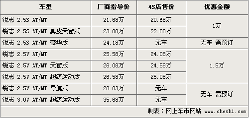 锐志的原车型是在日本广受好评的“MARK-X”系列,国产后的锐志同MARK X一样配备有2.5L和3.0L两种排量的发动机,但取消了四驱车型,全部为前置后驱,同时超长的轴距设计让乘员的空间也有了非常理想的状态。同时也是颇受改装车迷喜爱的一款车型,目前锐志在车款的价格上有一定幅度的优惠,最高可优惠1.5万元,具体车型和价格如下:
