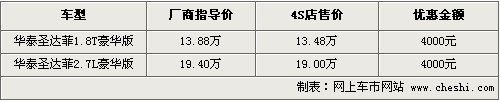 据4S店销售人员介绍,目前圣达菲在北京地区销售的主要是汽油版1.8T和2.7高配车型。其中2.7排量高配车型售价为19.4万,1.8T国四排放标准的豪华版售价为13.88万元。目前购车可以优惠现金4000元,如果到店的话还能有一定幅度的让利。现车方面,主要有银色、黑色、白色以及灰色等供应,可供挑选的余地很大。另据介绍,柴油版车型在北京均无法上牌,而这两款不存在此问题。