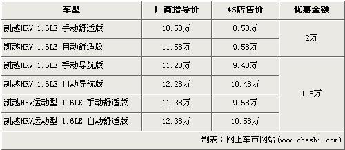 据经销商处销售人员介绍,凯越HRV共有6个车型在售,近期除了舒适版现金优惠仍然是2万元外,其他4款车型的均优惠1.8万元。入门车型的凯越HRV 1.6LE 手动舒适版现金优惠售价仍为8.58万元。而导航版与运动版车型优惠1.8万元,但是此两版车型店内均无现车,欲购买的消费者需交订金1万元,最早两周内可以提车。