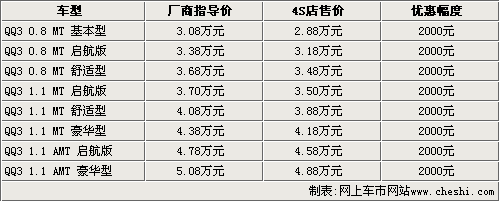 据奇瑞汽车4S店销售人员介绍,奇瑞QQ3目前车型都比较齐全,包括新上市的启航版车型都有现车销售。而且目前奇瑞QQ3全系都可以优惠2000元。另外销售人员表示,如果到店详谈,还有可能赠送一些装饰。