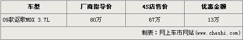 讴歌-MDX于07年4月13日于北京上市,MDX是本田高端品牌讴歌引进中国的第一辆豪华SUV车型。事隔1年有余,小改款的09款讴歌-MDX又被推出,其在08款的基础上增加了一些实用性的配件,动力方面则没有任何变动。近日据网上车市价格数据监测显示,讴歌MDX的现金优惠增加到了13万元,具体详情请看下表: