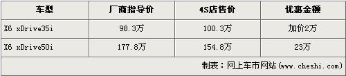 据北京宝马经销店销售人员介绍,现在在售的X6车型分为售98.3万元的35i车型和售价为177.8万元的50i两款车型。目前购买35i车型的消费者没有优惠,提现车还要加价2万元,售价从98.3万元上升到了100.3万元,排量更大的4.4升的50i车型有23万元的现金优惠,售价降到了154.8万元。销售人员还介绍,X6车型现车店内充足,消费者挑选的空间不小。
