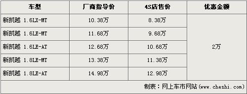 据4S店销售人员介绍,新凯越分为1.6L与1.8L两种排量车型,目前新凯越全系优惠2万元,较上个月的优惠降幅有所下降。经优惠后,全系最低配的1.6LX-MT车型售价下降到了8.38万元。经优惠后,1.8L手动和自动两款车型售价也下降到了11.38万元和12.98万元。销售人员还介绍,目前店内现车齐全,是消费者挑选的较好时机。