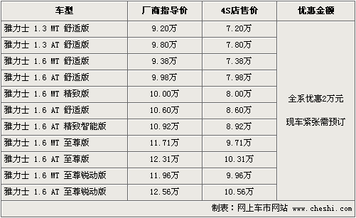 雅力士在欧洲是一款非常受欢迎的A0级小车,但在08年进入国内销售后,其销量并不乐观,但是从这款车的配置、安全性方面,仍然是一款值得购买的小车。根据网上车市价格监测系统显示,目前雅力士销售比较火爆,现车紧缺,近期购买雅力士全系车型可以优惠2万元。具体行情如下: