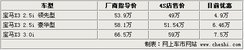 据4S店销售人员介绍:目前宝马X3全系3款车型全部有优惠,最高优惠7.5万元。目前X3 2.5i豪华型与3.0i有现车,2.5i豪华型现车颜色有黑色、金色、银色、灰色、白色,现车比较多颜色较齐全;3.0i车型仅有银色现车。X3领先型预定需等到今年底活明年初,如果不着急购买的消费者可以等待。目前购买X3任何一款车型,均可获得原车导航系统。