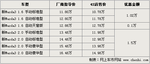 马自达3自4月份1.6L的自动天窗版车型上市以来,一直受到消费者关注。运动与操控完美结合让马自达3拥有较好的口碑。根据网上车市价格监测系统显示,马自达3现最高优惠1.5万元,1.6L有少量现车供应。具体行情如下: