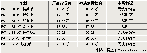 名爵作为南汽收购引入国内的品牌,在国产后保留了原汁原味的英伦风格。给平淡的中高级车市场带来一股异域风情,其中代表车型就是名爵MG7。名爵MG7从内而外都具有英伦气质,流线的车身设计,古典的大灯造型以及内饰中控台的风格,从一上市就得到时尚消费者的亲睐。近日根据网上车市价格监测系统显示,目前购买名爵MG7最高可以享受到1万元的现金优惠。具体车型见下表: