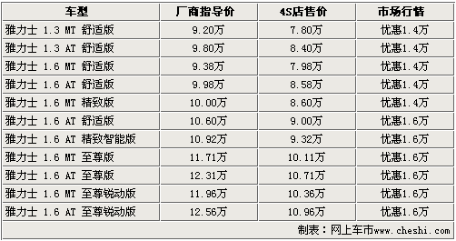 雅力士是一款在国内非常受欢迎的A0级小车,从这款车的配置、安全性方面,都是一款值得购买的小车。根据网上车市价格监测系统显示,近期雅力士最高优惠1.6万元,目前有部分型号的现车供应。具体车型行情如下: