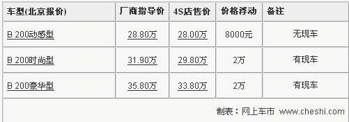 据北京奔驰4S店销售人员介绍:目前奔驰B级分为B200动感型、B200时尚型和B200豪华版三款车型,B200豪华型为今年新推出车型,售价为35.8万。其中时尚型和豪华型均可优惠2万元,优惠幅度较大,现车也较充足,只是没有配备真皮座椅和天窗的动感型一直没有现车。