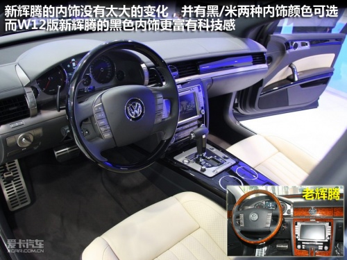 与它经过少许修改的外观不同,新辉腾的内饰几乎没有变化,整车主要有两种配色:原木色+米色与黑+银色可选。车内的设计、布局与老款车型完全相同,新辉腾W12版车型采用黑银色内饰+米色座椅,与典雅的V8车型所采用的原木色相比更富有冷冷的科技感。