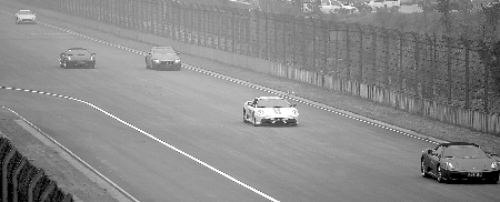 昨日上午11时许,记者在赛车场约1公里外,就听见引擎巨大的轰鸣声。走近后,只见一辆宝蓝色法拉利跑车从赛道直行路段呼啸而过,一辆红色豪车接踵而至,紧接着是一辆黄色豪车。直道加速,弯道变速。飞驰的豪车引起观众阵阵惊呼。赛道内侧空地,10余辆颜色款式各异的豪车整齐停放。车队后方不远处,停着一辆急救车。赛车场一名工作人员说,上午9时许,就陆续有豪车来到赛车场。